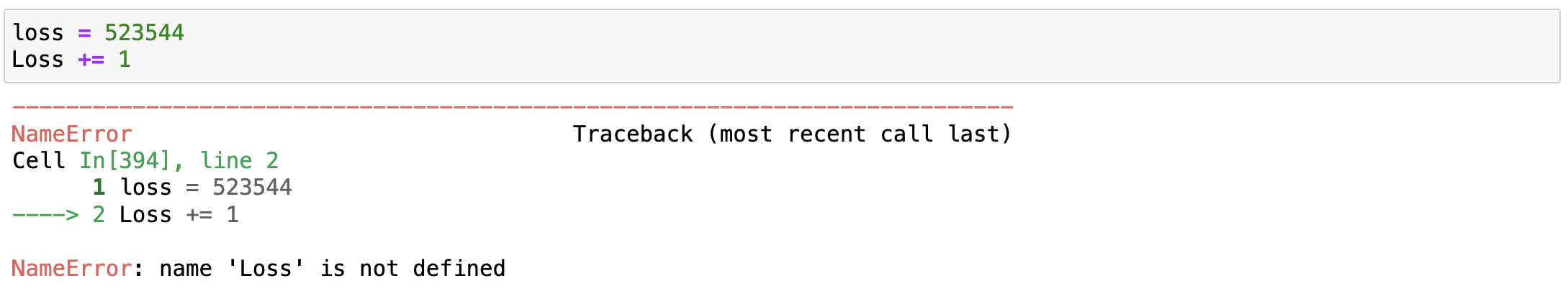 Examine the variable names carefully. Python is case-sensitive, so loss