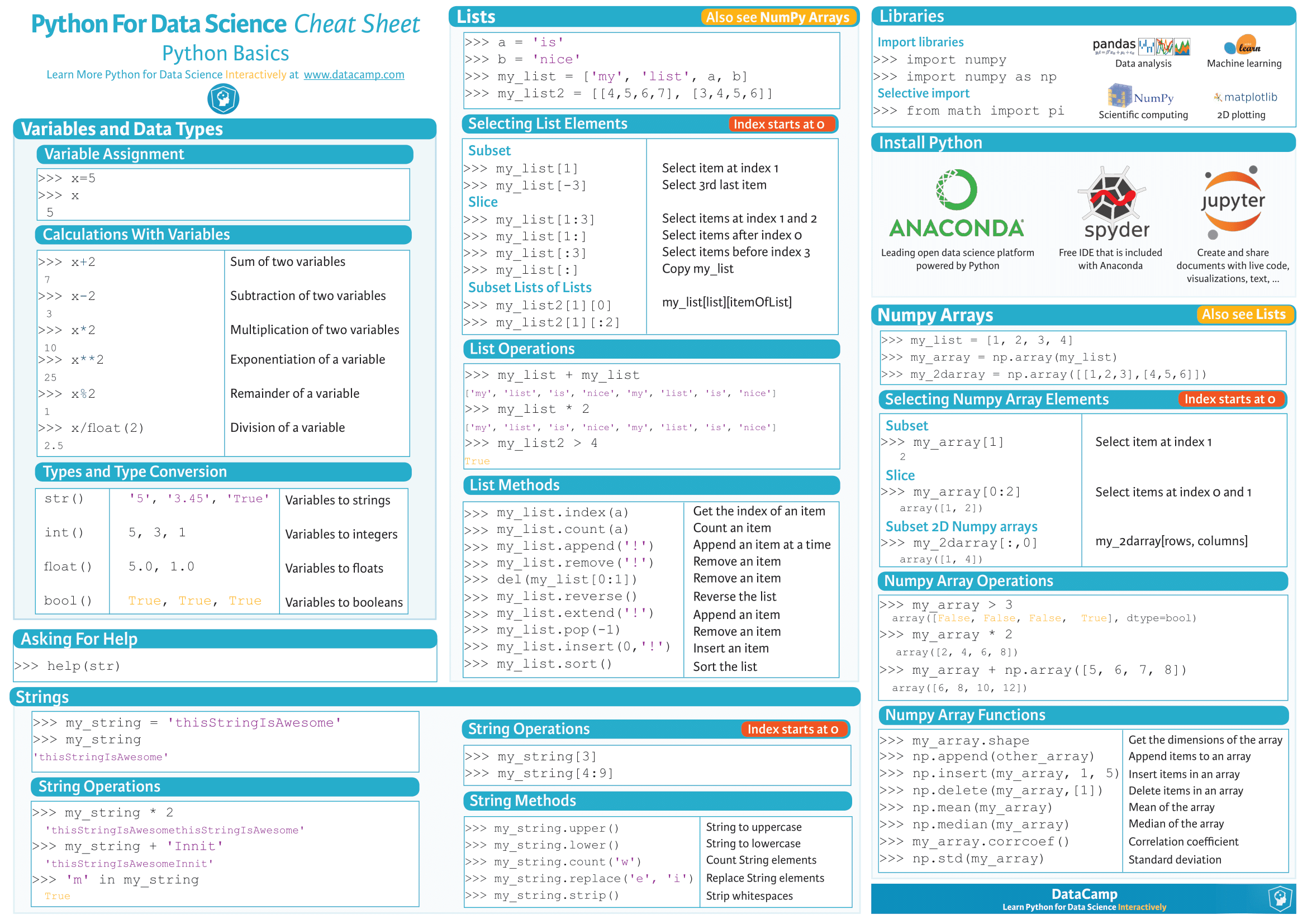 You can find an extensive cheatsheet for Python and use of data science libraries: