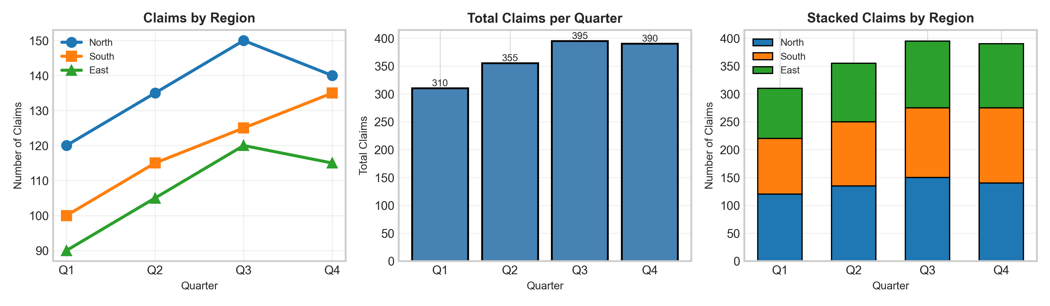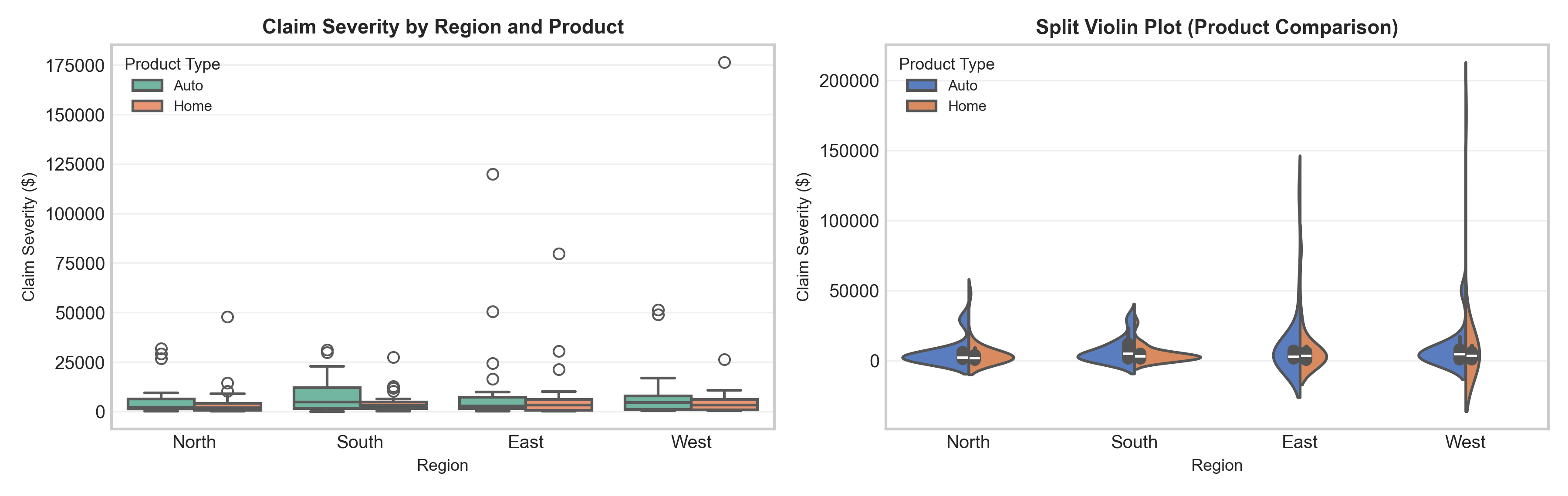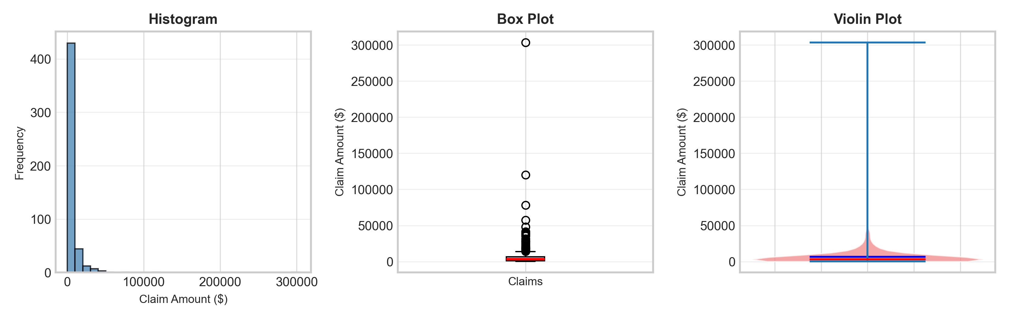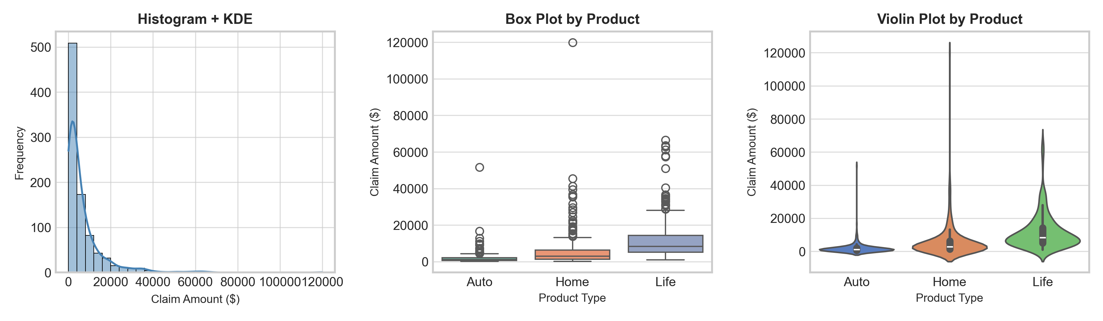 import pandas as pdimport seaborn as sns# Simulate claim severity data for different product typesnp.random.seed(42)n =300data = pd.DataFrame({'Product': np.repeat(['Auto', 'Home', 'Life'], n),'Claim_Amount': np.concatenate([ np.random.lognormal(7, 1, n), # Auto np.random.lognormal(8, 1.2, n), # Home np.random.lognormal(9, 0.8, n) # Life ])})# Set seaborn stylesns.set_style("whitegrid")fig, axes = plt.subplots(1, 3, figsize=(12, 3.5))# Histogram with KDEsns.histplot(data=data, x='Claim_Amount', kde=True, ax=axes[0], bins=30, color='steelblue', edgecolor='black', linewidth=0.5)axes[0].set_title("Histogram + KDE", fontsize=11, fontweight='bold')axes[0].set_xlabel("Claim Amount ($)", fontsize=9)axes[0].set_ylabel("Frequency", fontsize=9)# Box plot by categorysns.boxplot(data=data, x='Product', y='Claim_Amount', ax=axes[1], palette='Set2')axes[1].set_title("Box Plot by Product", fontsize=11, fontweight='bold')axes[1].set_ylabel("Claim Amount ($)", fontsize=9)axes[1].set_xlabel("Product Type", fontsize=9)# Violin plot by categorysns.violinplot(data=data, x='Product', y='Claim_Amount', ax=axes[2], palette='muted')axes[2].set_title("Violin Plot by Product", fontsize=11, fontweight='bold')axes[2].set_ylabel("Claim Amount ($)", fontsize=9)axes[2].set_xlabel("Product Type", fontsize=9)plt.tight_layout()plt.show()