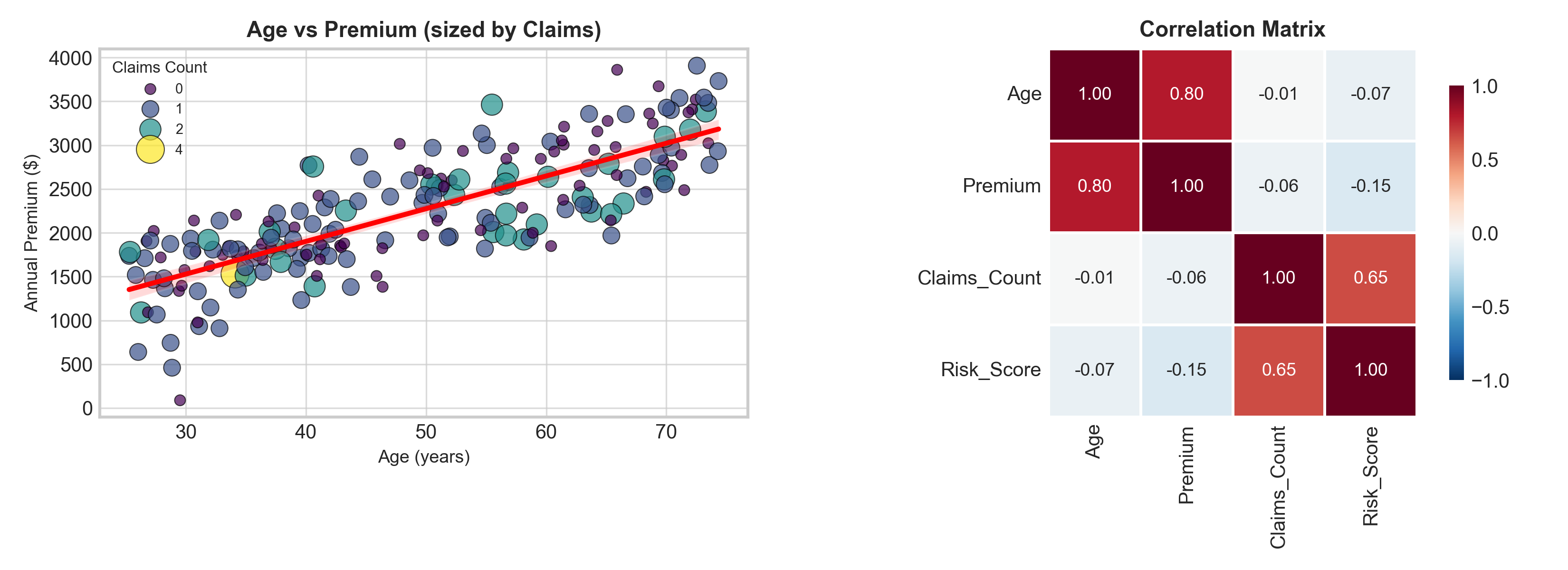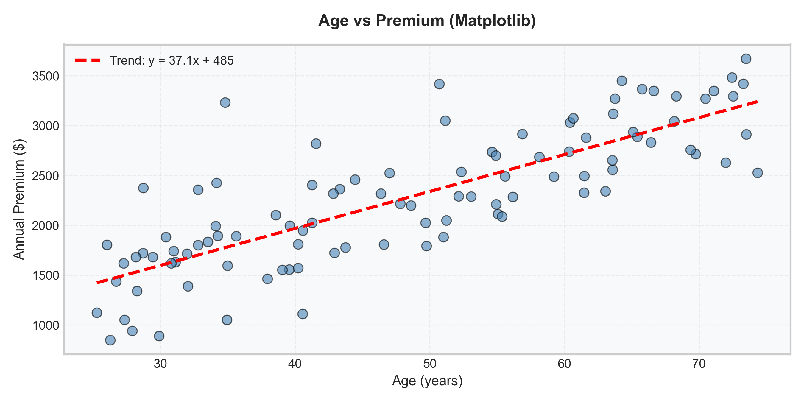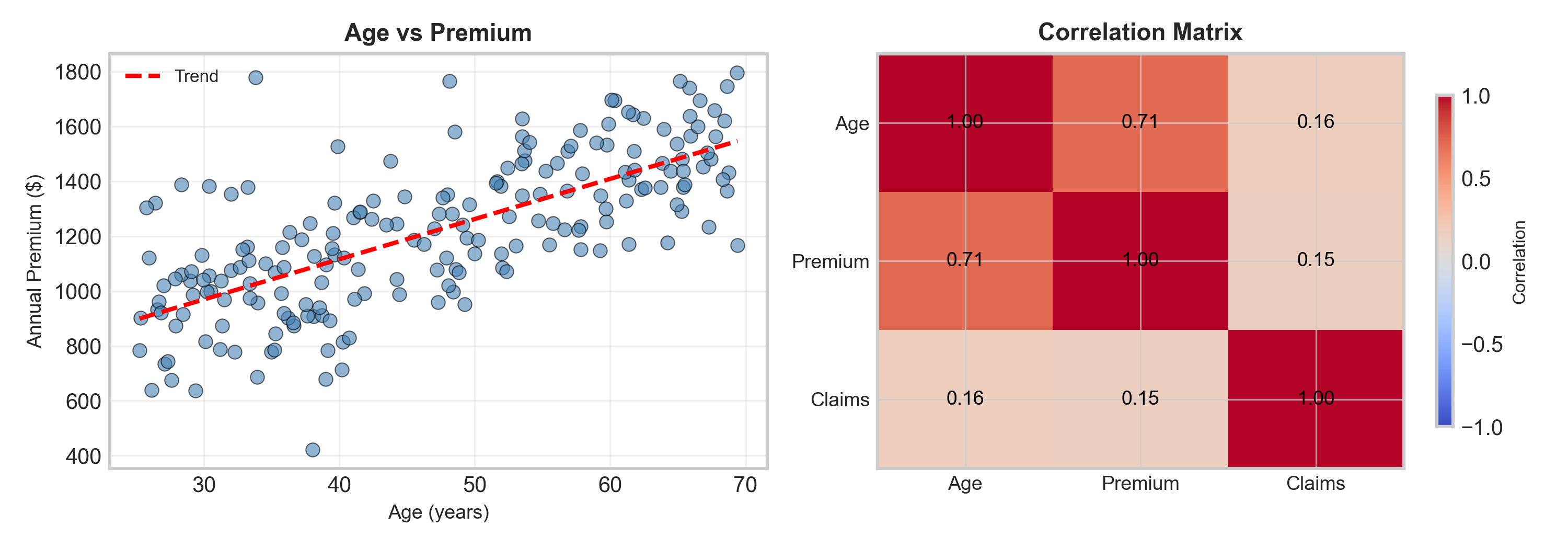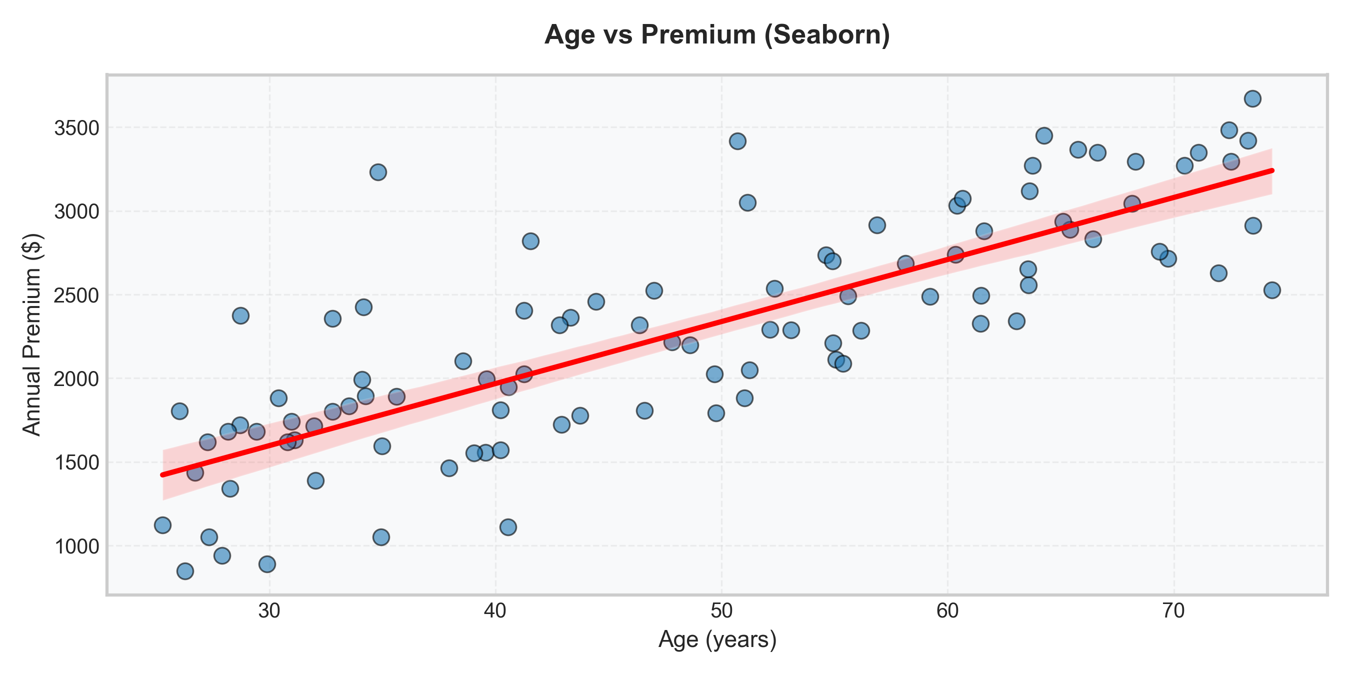 import pandas as pdimport seaborn as sns# Simulate claim severity data for different product typesnp.random.seed(42)n =300data = pd.DataFrame({'Product': np.repeat(['Auto', 'Home', 'Life'], n),'Claim_Amount': np.concatenate([ np.random.lognormal(7, 1, n), # Auto np.random.lognormal(8, 1.2, n), # Home np.random.lognormal(9, 0.8, n) # Life ])})# Set seaborn stylesns.set_style("whitegrid")fig, axes = plt.subplots(1, 3, figsize=(12, 3.5))# Histogram with KDEsns.histplot(data=data, x='Claim_Amount', kde=True, ax=axes[0], bins=30, color='steelblue', edgecolor='black', linewidth=0.5)axes[0].set_title("Histogram + KDE", fontsize=11, fontweight='bold')axes[0].set_xlabel("Claim Amount ($)", fontsize=9)axes[0].set_ylabel("Frequency", fontsize=9)# Box plot by categorysns.boxplot(data=data, x='Product', y='Claim_Amount', ax=axes[1], palette='Set2')axes[1].set_title("Box Plot by Product", fontsize=11, fontweight='bold')axes[1].set_ylabel("Claim Amount ($)", fontsize=9)axes[1].set_xlabel("Product Type", fontsize=9)# Violin plot by categorysns.violinplot(data=data, x='Product', y='Claim_Amount', ax=axes[2], palette='muted')axes[2].set_title("Violin Plot by Product", fontsize=11, fontweight='bold')axes[2].set_ylabel("Claim Amount ($)", fontsize=9)axes[2].set_xlabel("Product Type", fontsize=9)plt.tight_layout()plt.show()